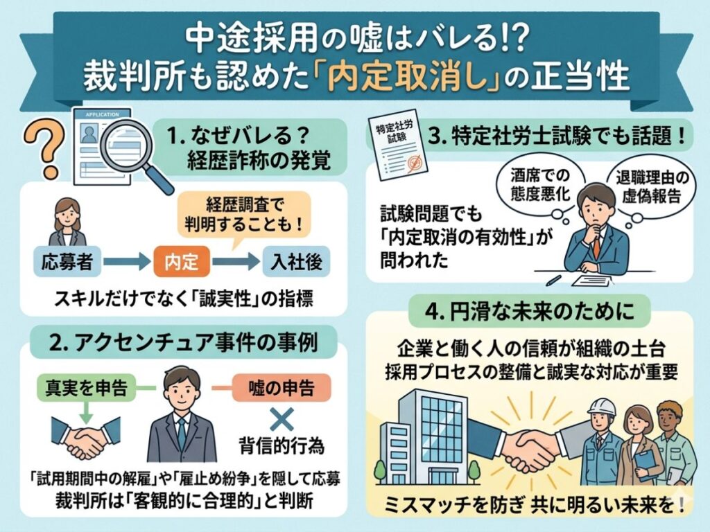 事案の概要: 内定者が直近1年間の「雇止めによる紛争」や「試用期間中の解雇歴」を隠して応募し、後の経歴調査で発覚しました。