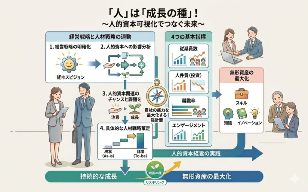 令和8年に改訂された最新の「人的資本可視化指針」では、これまで曖昧だった「経営戦略と人材戦略をどう結びつけるか」という具体的な手順が明確に示されました。
